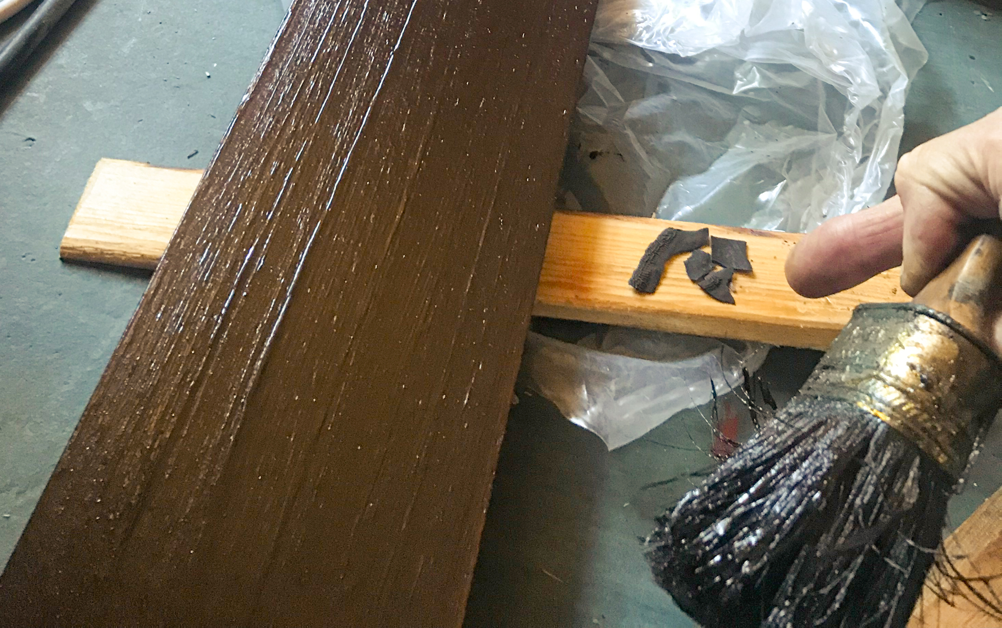Nya vindskivor som linoljemålas i samma kulör som flagorna från originalbrädan